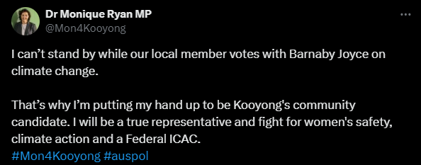 While the then candidate for Kooyong, Monique Ryan, used Barnaby Joyce as the boogey man in her candidate announcement, as did Wentworth candidate Allegra Spender.