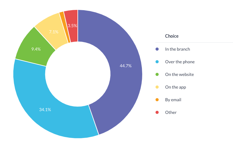 The second question asked how people liked to deal with the bank when there is a problem. Note, we intentionally worded the question to focus on what happens when something goes wrong – yeah, most people bank online or other non-face-to-face way, but it’s when things go wrong that tells the most about how people use services.