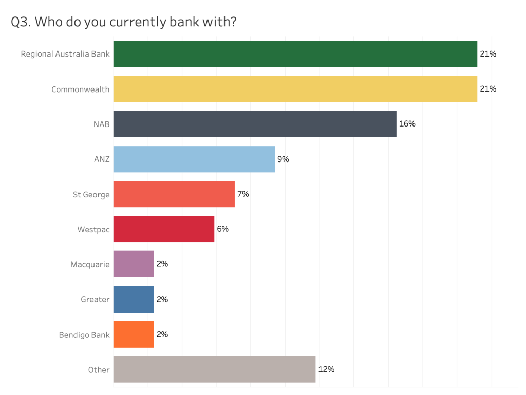 And the third question asked who people currently bank with. This question was to find out if New Englanders were voting with their feet and choosing to bank with those keeping the branches open – and the results were pretty clarifying as to why Westpac/St George and ANZ are leading the way in branch closures.