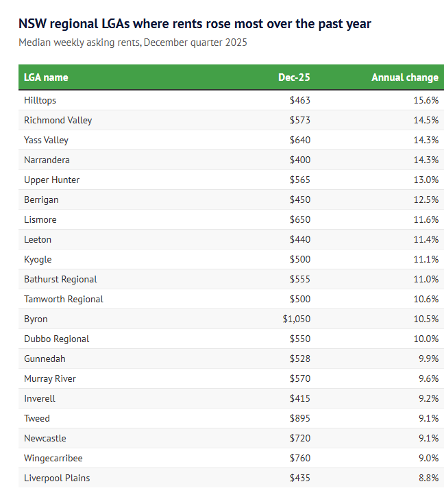 “Rents in many parts of regional NSW are booming, with population spillover, a bumper agricultural season and ‘rentvestors’ chasing cheaper buys, colliding with a housing drought,” Mr Bowman said.