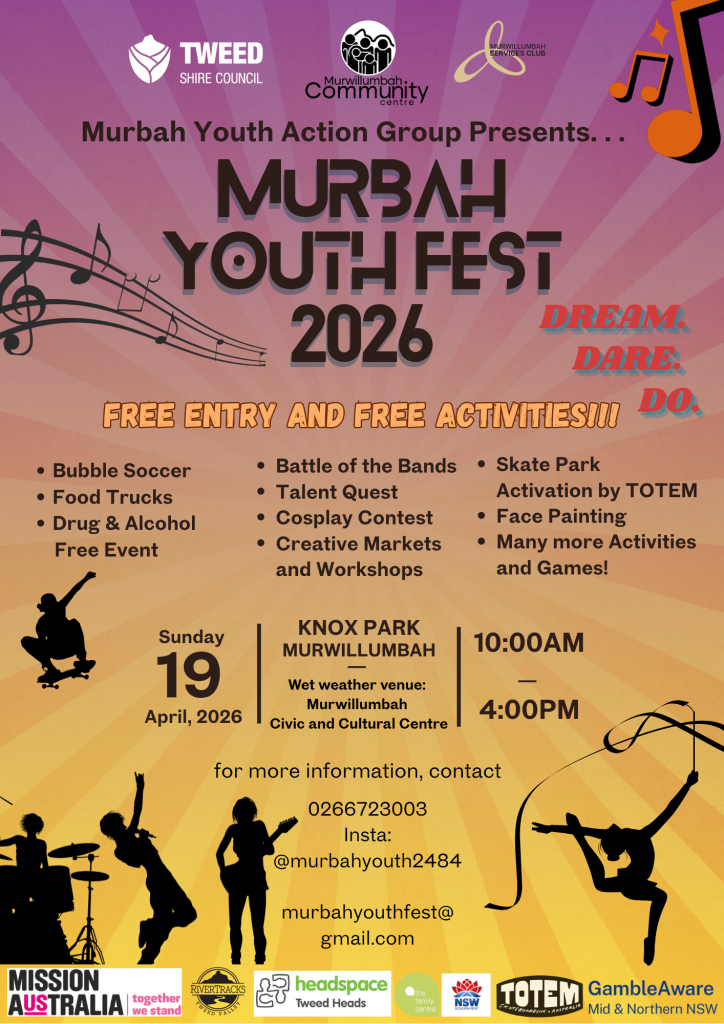 Murbah Youth Fest will take place at Knox Park, Murwillumbah, on Sunday, 19 April from 10 am to 4 pm. Entry is free, and all are welcome.